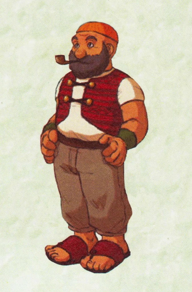 Mayor is a character in Dark Cloud. He is the Mayor of Norune Village, and one of the only people left after the Dark Genie attacks, and the first person that players talk to in the game. He stated that he used to sail around the world when he was younger. Mayor wears very plain clothes; a reddish-brown vest, which matches the color of his sandals and a pair of light brown pants, as well as a yellow cap. He also has a gray beard and is always seen smoking a pipe.